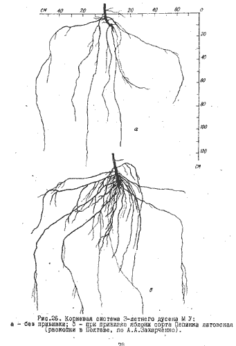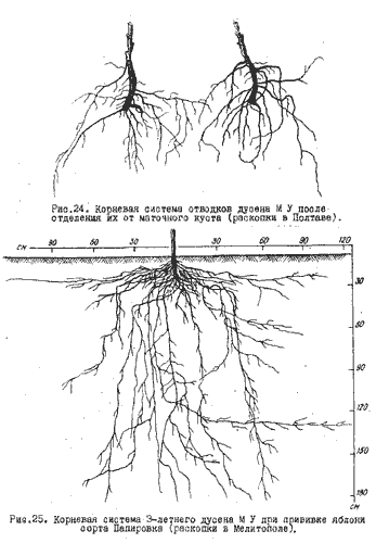 Корневую систему 3-летнего дусена М V мы изучали на Мелитопольской