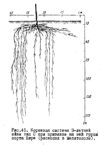 Корневую систему 3-летних растений разных сортов груши, привитых на