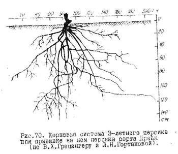 Гортанова, 1971) корни 3-летних деревьев на персике (рис.70)