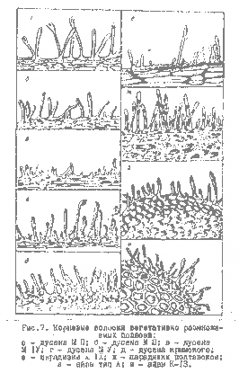 2 - полускелетные корни разных порядков ветвления; 3 - обрастающие