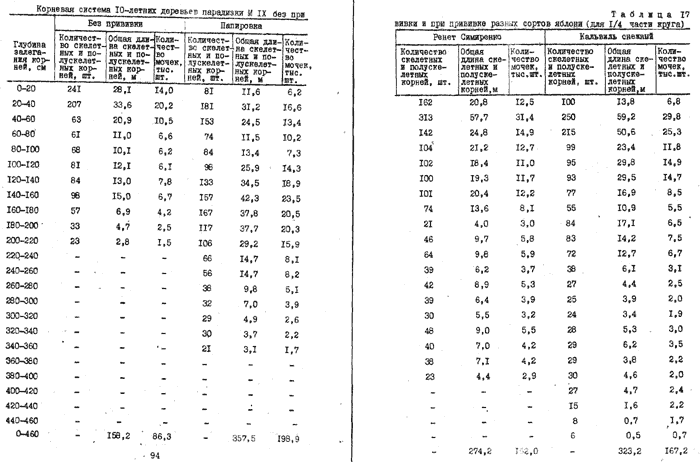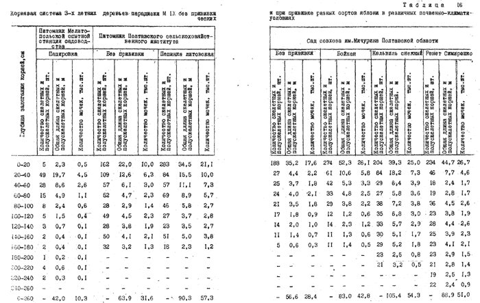 Кроме 3-летних, мы раскапывали также 10-летние деревья парадизки М IX без прививки и с прививкой разных сортов. Раскопки производились в саду совхоза им. Мичурина Полтавской области (табл.17).