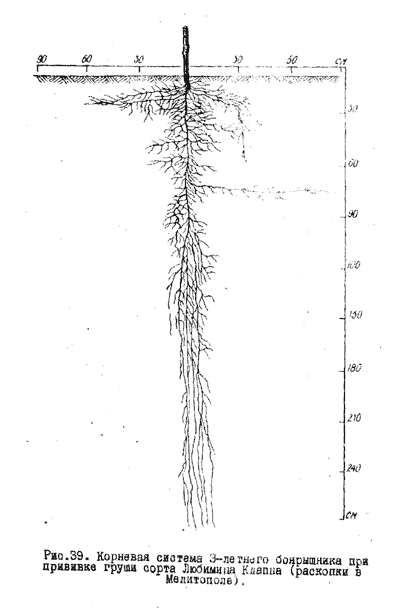 корневую систему 3-летних деревьев сорта Любимица Клаппа, привитого