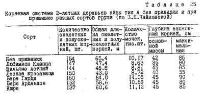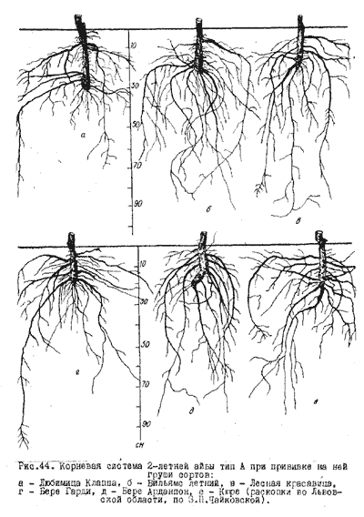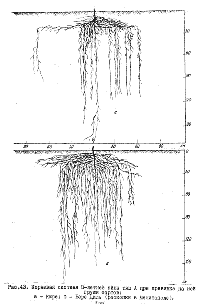 Корневую систему 3-летних деревьев разных сортов груши, привитых на